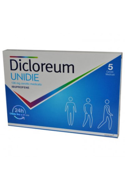 Controindicazioni/Effetti indesideratiIpersensibilità al principio attivo (ibuprofene) o ad uno qualsiasi degli eccipienti. È controindicato l’utilizzo di DICLOREUM UNIDIE in soggetti in cui si sia manifestata una precedente ipersensibilità all’acido acetilsalicilico o ad altri analgesici o antinfiammatori non steroidei, in pazienti con pregressi episodi di broncospasmo, angioedema o reazioni anafilattoidi. La somministrazione di DICLOREUM UNIDIE è da evitare in pazienti affetti da ulcera peptica in fase attiva, asma bronchiale o affetti da grave insufficienza renale ed epatica. È altresì da evitare l’utilizzo di DICLOREUM UNIDIE in pazienti con storia di emorragia gastrointestinale o perforazione relativa a precedenti trattamenti attivi o storia di emorragia/ulcera peptica ricorrente (due o più episodi distinti di dimostrata ulcerazione o sanguinamento), in terapia con anticoagulanti (vedere paragrafo 4.5) ed infine in casi di grave insufficienza cardiaca. Evitare inoltre l’applicazione del cerotto medicato su cute lesa o in zone che presentino dermatosi o infezioni. Evitare il contatto con gli occhi e le mucose. L’uso di DICLOREUM UNIDIE è controindicato durante il terzo trimestre di gravidanza e allattamento (vedere paragrafo 4.6) e nei bambini al di sotto di 12 anni.