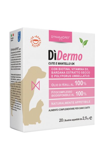 Alimento complementare utile per sostenere il fisiologico benessere di cute ed annessi cutanei. La formula è arricchita con omega 3 da olio di krill e biotina. I suoi fitocomplessi, uniti alla presenza nella formula di omega 3 da purissimo olio di Krill di ottima assimilabilità, ne fanno un prodotto unico e irrinunciabile per il benessere dell'animale.