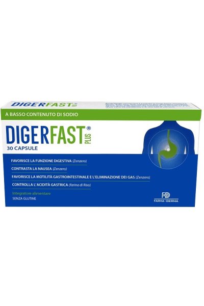 Digerfast plus è un integratore alimentare a base di zenzero, farina di riso, magnesio e vitamine del gruppo B (B1, B2 e B6). Lo zenzero ha funzione digestiva e antinausea, aiuta a favorire la motilità gastrointestinale e l'eliminazione dei gas, oltre a contrastare gli stati di tensione localizzati e i disturbi del ciclo mestruale. La farina di riso favorisce il controllo dell'acidità gastrica e svolge un'azione emolliente e lenitiva a livello del sistema digerente. Il magnesio contribuisce al mantenimento dell'equilibrio elettrolitico.