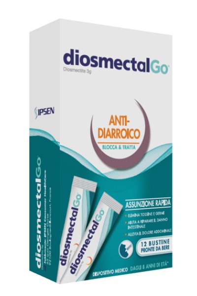 Dispositivo medico, sospensione pronta da bere, in bustine monodose per somministrazione orale. DiosmectalGo è indicato per: