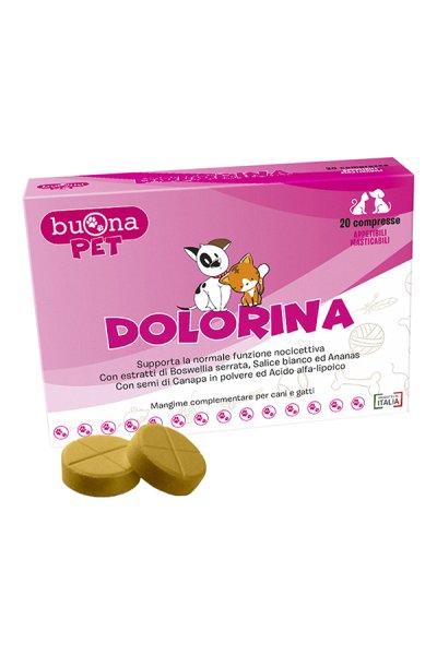 Mangime complementare per cani e gatti con estratti di Boswellia serrata e Salice bianco, Ananas gambo, semi di Canapa ed Acido alfa-Lipoico. DOLORINA è formulata in compresse appetibili masticabili ed è utile per supportare la normale funzione nocicettiva nell’animale.