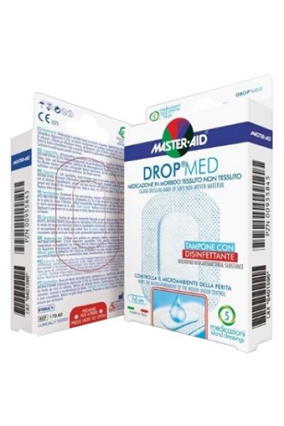 Medicazione traspirante in tessuto non tessuto, dotata di un tampone assorbente con sostanza disinfettante (clorexidina digluconato 0,5%).