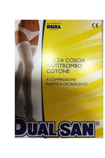 Dispositivo medico indicato per tutte quelle situazioni che aumentano il rischio di trombosi come interventi chirurgici, fratture o traumi agli arti inferiori, riduzioni della mobilità. La compressione regolarmente dal malleolo alla coscia è da 18-20 mmHg. Foro di ispezione collocato sulle dita dei piedi e disegno anatomico ottenuto da lavoro e gestione elettronica computerizzata. Tessuto biestensivo ipoallergenico in cotone. Ottima resistenza e traspirabilità. Elastico con silicone cucito al bordo superiore della calza. Controindicato in caso di dermatiti e arteriopatie.