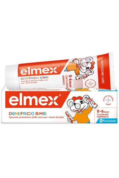Dentifricio speciale per la protezione dalla carie dei denti da latte. Contiene un unico fluoruro amminico per un triplice effetto protettivo: crea una barriera protettiva di fluoruro di calcio sullo smalto dentale. Rende i denti più resistenti alla perdita minerale dovuta alla carie, aiuta a reincorporare i minerali dissolti dalla carie. Dall’eruzione del primo dente da latte fino al secondo anno di vita, i denti da latte dovrebbero essere puliti una volta al giorno con elmex bimbi dentifricio, passando a due volte al giorno successivamente. I bambini piccoli dovrebbero lavare i denti con uno speciale spazzolino educativo. Dovrebbero usare una piccola dose di dentifricio, non più grande di un pisello.Contenuto di fluoruro 500 ppm. Sapore gradevole, ma senza aromi di frutta per evitare di favorire l’ingestione da parte del bambino.