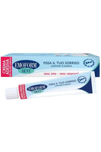 Crema adesiva per protesi dentali a base di resine micronizzate a tenuta rapida e duratura della dentiera che impedisce le infiltrazioni di cibo tra protesi e gengive e previene irritazioni ed alitosi.