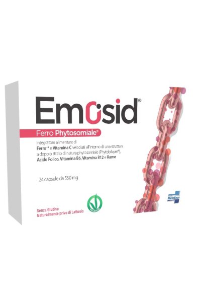 Integratore alimentare a base di ferro Phytosomiale (ferro++ e vitamina C veicolati all’interno di una struttura a doppio strato di natura Phytosomiale: tecnologia Phytobilayer). L'uso del ferro Phytosomiale permette di eliminare completamente i disturbi normalmente correlati all'uso del ferro orale. La biodisponibilità del Fe++ presente in Emosid è particolarmente elevata ed è attribuibile all’utilizzo di un'innovativa forma di Phytosoma attivo a doppio strato, ottenuto attraverso la particolare e brevettata tecnologia Phytobilayer. Il ferro Phytosomiale supera indenne la barriera gastrica e viene assorbito a livello intestinale. Il ferro Fe++ contribuisce alla formazione di globuli rossi ed emoglobina, alla funzionalità del sistema immunitario, al normale trasporto di ossigeno nell’organismo e riduce stanchezza ed affaticamento. Il rame e la vitamina C contribuiscono al normale trasporto e assorbimento del ferro orale nell’organismo. L’acido folico contribuisce alla normale emopoiesi.