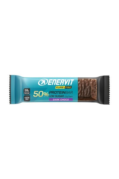 Barretta proteica ricoperta di cioccolato fondente con edulcorante.