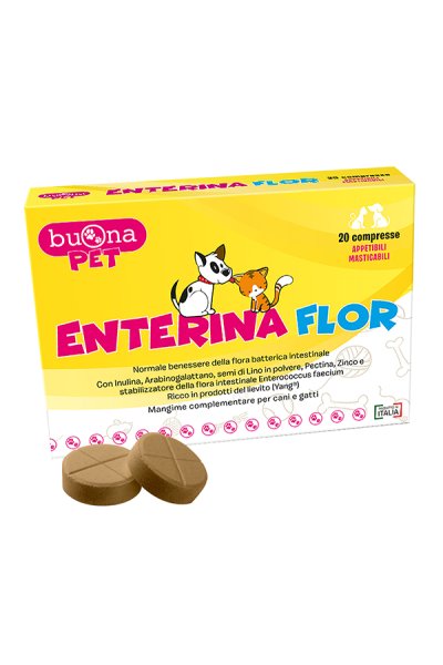 ENTERINA FLOR è formulato con Prodotti del lievito (Yang), Inulina da radici di Cicoria, Arabinogalattano da corteccia di Larice, semi di Lino in polvere, Zinco, Pectina ed Enterococcus faecium (additivo stabilizzatore della flora intestinale), per favorire il normale benessere della flora batterica intestinale nel cane e nel gatto.
