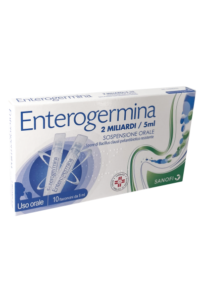 Enterogermina è un medicinale costituito da una sospensione di 4 ceppi (SIN, O/C, T, N/R) di spore di Bacillus clausii, abitualmente presente nell''intestino, privo di capacità di causare malattie (privo di potere patogeno).