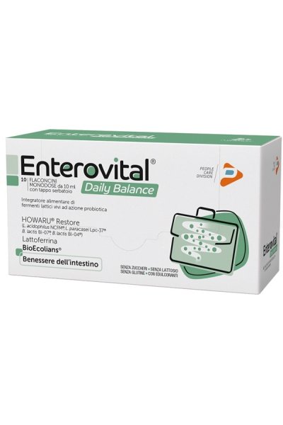 Enterovital Daily Balanca è costituito da HOWARU Restore, una miscela di quattro ceppi probiotici [due ceppi di lattobacilli (L. acidophilus NCFM, L. paracasei Lpc-37) e due ceppi di bifidobatteri (B. lactis Bi-07, B. lactis Bl-04)], altamente vitali, in quanto liofilizzati, e attivi nel favorire l'equilibrio della flora intestinale, in sinergia con BioEcolians, fibra prebiotica naturale (GOSa) ben tollerata e a dosaggio ottimizzato, che rappresenta un vero e proprio nutrimento delle comunità batteriche caratteristiche del microbiota di un intestino in salute, favorendo l'equilibrio della flora batterica intestinale. La formula di Enterovital Daily Balance è arricchita, inoltre, con lattoferrina, una glicoproteina multifunzionale, appartenente alla famiglia delle transferrine, responsabile della captazione e del trasporto del ferro e che si trova naturalmente nelle secrezioni come latte, lacrima e saliva. L'intestino funge da barriera tra organismo e ambiente esterno.
