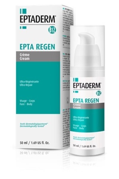 Crema ideata per ripristinare l'equilibrio della pelle, rinforzare la barriera cutanea, lenire e idratare. Grazie alla sua formula costituita da una miscela polivitaminica ed estratti naturali e grazie alla presenza della vitamina B12, EPTA REGEN Crema è in grado di favorire la rigenerazione della pelle, restituendole la naturale densità, la giusta compattezza e il corretto equilibrio.