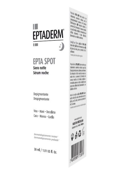 EPTA SPOT Siero notte è un trattamento cosmetico indicato per le iperpigmentazioni cutanee che favorisce l'attenuazione delle macchie esistenti e previene la formazione di nuove macchie. La sua formula completa e innovativa ha un effetto schiarente e dona elasticità, luminosità e un colorito uniforme. Dermatologicamente testato.