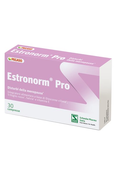 Integratore alimentare a base di Dioscorea villosa (progeplus), trifoglio rosso e salvia, che contrastano i disturbi della menopausa. La salvia è utile nel processo di regolazione della sudorazione. Estronorm PRO contiene inoltre vitamina E, che protegge le cellule dallo stress ossidativo.