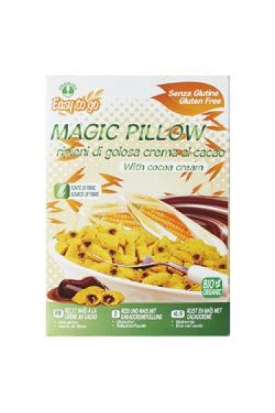 Croccanti cuscinetti di mais e riso, ripieni con crema al cacao. Senza glutine e fonte di fibre.Ingredienti