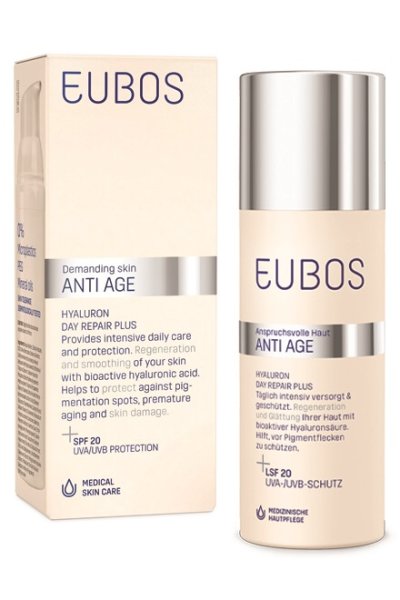 La crema giorno con acido ialuronico Eubos Hyaluron Day Repair Plus protegge la pelle dal fotoinvecchiamento grazie a un efficace filtro UV SPF20. Una crema idratante e anti età contenente Vitamina C, ad azione antiossidante e protettiva.