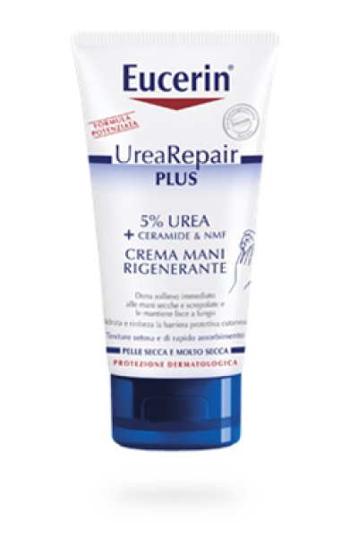 Eucerin UreaRepair Crema Mani Rigenerante 5% Urea contiene urea, ceramide ed altri fattori di idratazione naturale (NMF).
