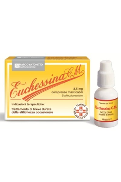 Posologia• Compresse: Adulti: da 1 a 2 compresse. Bambini (al di sopra dei 3 anni): da mezza a 1 compressa. Le compresse di Euchessina C.M. sono divisibili per facilitare l’assunzione di dosi rifratte. • Gocce orali: Adulti: da 5 a 10 gocce. Bambini (oltre i 3 anni): da 2 a 5 gocce. La dose corretta del lassativo è quella minima sufficiente a produrre una facile evacuazione di feci soffici. È consigliabile usare inizialmente la dose minima prevista. Quando necessario, la dose può essere poi aumentata, ma senza mai superare quella massima indicata. Assumere preferibilmente la sera. I lassativi devono essere usati il meno frequentemente possibile e per non più di sette giorni. L’uso per periodi di tempo maggiori richiede la prescrizione del medico dopo adeguata valutazione del singolo caso. Ingerire insieme ad una adeguata quantità di acqua (un bicchiere abbondante). Una dieta ricca di liquidi favorisce l’effetto del medicinale.
