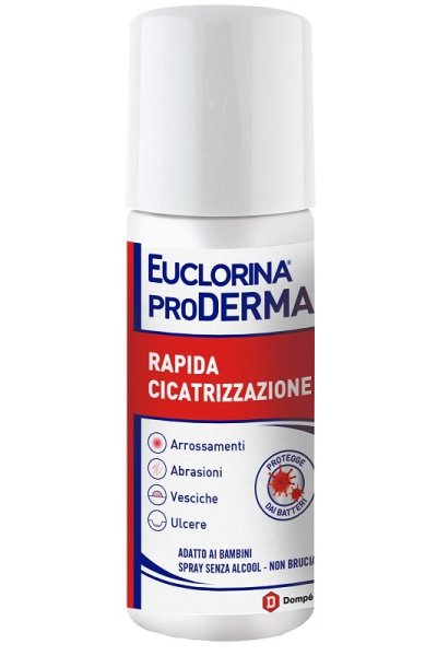 Dispositivo medico in polvere spray che crea una barriera protettiva coadiuvante il trattamento di ferite, ulcere, abrasioni, ustioni minori, lesioni cutanee con essudato, eritemi da pannolino, macerazioni da sudore e lesioni traumatiche superficiali. Euclorina ProDerma Spray è indicato anche nella medicazione delle ferite post-chirurgiche e del moncone del cordone ombelicale. Il dispositivo medico forma una barriera filmogena protettiva contro le aggressioni microbiche, favorendo il ripristino delle normali condizioni fisiologiche per una rapida cicatrizzazione.
