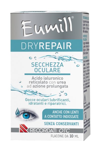 Soluzione sterile per uso oftalmico a pH fisiologico a base di acido ialuronico reticolato con urea, secondo una tecnologia brevettata, così da aumentare e migliorare le naturali proprietà meccaniche dell'acido ialuronico, rendendolo in grado di resistere più a lungo alla degradazione da parte delle ialuronidasi rispetto all'acido ialuronico naturale. La struttura reticolata che l'acido ialuronico forma offre idratazione ed è in grado di trattenere a lungo le molecole di acqua in modo da migliorare le intrinseche proprietà lubrificanti dell'acido ialuronico mentre, aumentando al contempo la sua azione idratante, è indicato come adiuvante nella sindrome dell'occhio secco. L'acido ialuronico reticolato è inoltre efficace nel contrastare radicali liberi e nell'esercitare un'azione riepitelizzante per una maggiore protezione della superficie corneale. L'acido ialuronico reticolato conferisce al prodotto proprietà lubrificanti, idratanti e riparatrici; è inoltre in grado di alleviare la secchezza oculare dovuta alla sindrome dell'occhio secco e donare sollievo in caso di stanchezza o irritazione oculare determinata da processi infiammatori o condizioni ambientali. Eumill DryRepair allevia rossore, secchezza, fatica e discomfort oculare causati da sindrome dell'occhio secco, fattori ambientali come vento, fumo, inquinamento, prolungata esposizione alla luce solare, salsedine, acqua di mare o piscina, studio o lavoro intensi, prolungato utilizzo del computer, lunghi periodi di guida, problematiche di lacrimazione generate da processi infiammatori, chirurgia oculare o chirurgia estetica palpebrale e blefariti croniche. Idrata e lubrifica la cornea e la congiuntiva in caso di secchezza oculare dovuta all'uso di lenti a contatto. Questa formula è stata sviluppata per donare il massimo comfort già dai primi istanti dopo l'applicazione. È indicata per un utilizzo quotidiano sia diurno che notturno. Non contiene conservanti e/o molecole ad azione anti-infiammatoria o vaso-costrittrice.