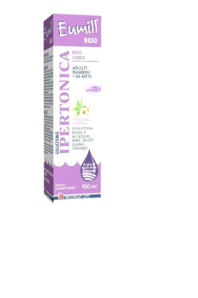 Eumill naso soluzione ipertonica* decongestiona le cavità nasali in caso di naso chiuso dovuto a raffreddore, sinusite, rinite, rinite allergica e rinite cronica. L'acqua di mare ipertonica ha un'azione decongestionante immediata e agevola l'eliminazione del muco, delle impurità e egli agenti patogeni. È efficace anche nella prevenzione e come coadiuvante di riniti, riniti allergiche, riniti croniche e sinusiti o dopo interventi chirurgici alle cavità nasali. Eumill naso soluzione ipertonica, acqua di mare 100% naturale, contiene Sali minerali e oligoelementi marini (quali rame, manganese, iodio, zinco, ecc.). che proteggono la mucosa nasale. Unisce i benefici dell'acqua di mare all'effetto decongestionante di una soluzione ipertonica, senza aggredire le mucose nasali.