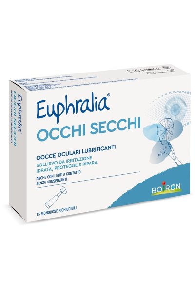 Euphralia OCCHI SECCHI gocce oculari lubrificanti è indicato in caso di occhio secco o irritato. Il sodio ialuronato contenuto nella soluzione conferisce al prodotto proprietà mucomimetiche e viscoelastiche in modo da garantire un’adeguata lubrificazione della superficie oculare, proteggendola dall’attrito generato dai movimenti oculari. Per questa ragione, lenisce gli occhi secchi e irritati. Inoltre, il polimero è in grado di trattenere l’acqua e contemporaneamente interagire con l’epitelio oculare. Per questo motivo, la soluzione è in grado di mantenere la superficie oculare umidificata, rinfresca gli occhi secchi e irritati e aumenta la stabilità del film lacrimale, proteggendo la mucosa oculare dagli agenti esterni. La formula contiene anche: acque distillate di Ginkgo biloba, Centella asiatica, mirtillo e finocchio per assicurare un’azione idratante, sodio cloruro e un sistema tampone (acido borico e sodio tetraborato decaidrato) per garantire una soluzione fisiologica.
