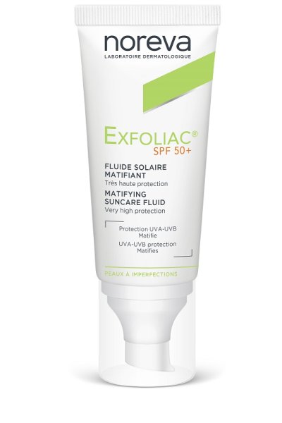 Exfoliac Fluido Solare SPF 50+ destinato alle pelli grasse e impure, contiene filtri efficaci e ad ampio spettro UVA/UVB per una protezione ottimale. Formulato con un complesso unico di agenti seboregolatori ed opacizzanti, per proteggere la pelle e purificarla.