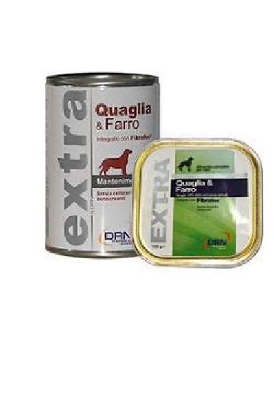 alimento umido per cani con proteine (62%) ottenute dalla quaglia, iperdigeribile e molto appetibile e farro, fonte di carboidrati. Integrato con Fibrafos.