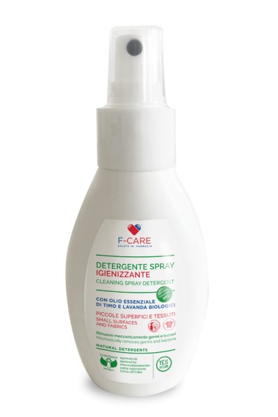 Detergente Spray Igienizzante con olio essenziale di timo e lavanda biologici. Le sostanze lavanti contenute nella formulazione esercitano un'azione meccanica nei confronti dei microrganismi ed igienizzano superfici e tessuti. Adatto a vegani.