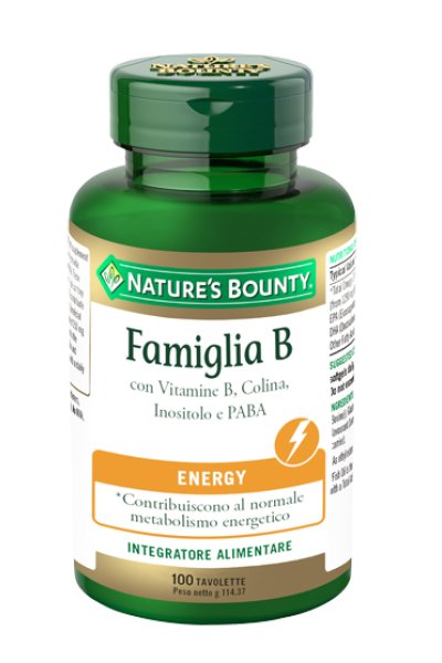 Famiglia B è un integratore alimentare a base di vitamine del gruppo B, colina, inositolo e PABA. L'acido pantotenico, la niacina, la riboflavina, la vitamina B12, la vitamina B6 e l'acido folico contribuiscono alla riduzione di stanchezza e affaticamento. Inoltre niacina, vitamina B6, riboflavina, tiamina, biotina e vitamina B12 contribuiscono al normale funzionamento del sistema nervoso e al normale metabolismo energetico, mentre per la naturale funzione psicologica sono utili niacina, vitamina B6, tiamina e acido folico. La biotina, infine, contribuisce al mantenimento di pelle e capelli normali. Adatto anche a vegetariani e vegani.