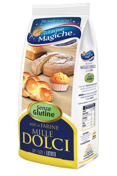 Preparato dietetico Mille Dolci senza Glutine e senza lievito destinato a soggetti intolleranti al glutine, realizzato con materie prime prive di glutine e frumento.