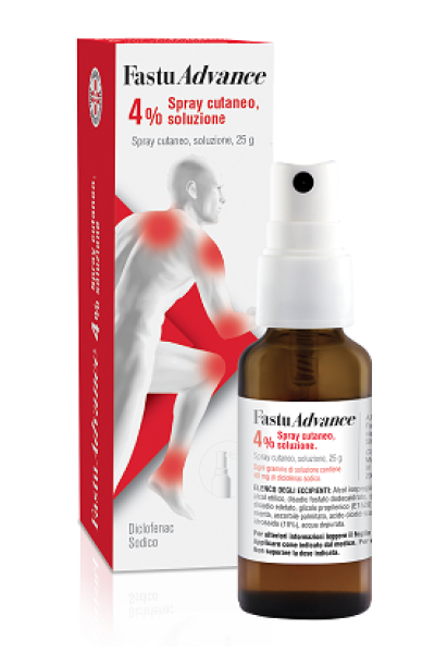 *Il prurito è stato segnalato con una frequenza pari allo 0,9% in uno studio clinico, in cui 236 pazienti con distorsioni della caviglia sono stati trattati con 4-5 spruzzi di Fastuadvance tre volte al giorno (120 soggetti) o con placebo (116 soggetti) per 14 giorni.