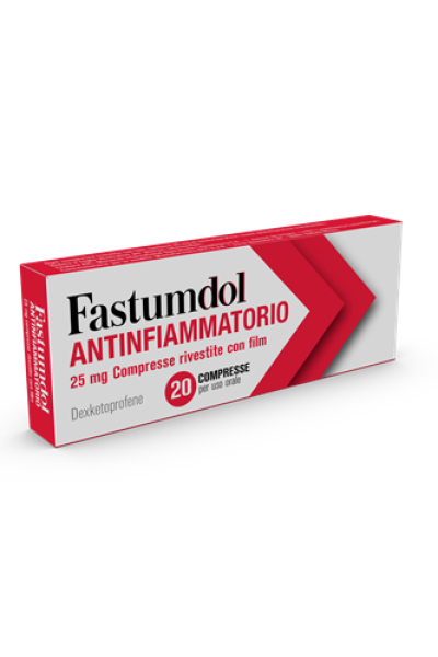 PosologiaPosologia Adulti In base alla natura e all’intensità del dolore, la dose raccomandata è in genere di 12,5 mg ogni 4–6 ore o di 25 mg ogni 8 ore. La dose giornaliera totale non deve superare i 75 mg. Gli effetti indesiderati possono essere minimizzati con l’uso della più bassa dose efficace per la più breve durata possibile di trattamento che occorre per controllare i sintomi (vedere paragrafo 4.4). FASTUMDOL ANTINFIAMMATORIO compresse non è indicato nei trattamenti a lungo termine e la somministrazione va limitata al solo periodo sintomatico. Popolazione pediatrica FASTUMDOL ANTINFIAMMATORIO compresse non è stato studiato nei bambini e negli adolescenti. Pertanto, la sicurezza e l’efficacia non sono state stabilite ed il prodotto non deve essere usato nei bambini e adolescenti. Anziani Nel paziente anziano si raccomanda di iniziare la terapia al limite inferiore dell’intervallo terapeutico (50 mg di dose giornaliera totale). Il dosaggio può essere aumentato in modo da raggiungere quello impiegato per la popolazione generale solo dopo che sia stata accertata una buona tollerabilità generale. Disfunzione epatica I pazienti con insufficienza epatica da lieve a moderata devono iniziare la terapia a dosi ridotte (50 mg di dose giornaliera totale) e devono essere sottoposti a stretto controllo medico. FASTUMDOL ANTINFIAMMATORIO compresse non deve essere usato in pazienti con insufficienza epatica grave. Disfunzione renale Nei pazienti con danno renale lieve (clearance della creatinina 60 – 89 ml/min), il dosaggio iniziale deve essere ridotto a 50 mg di dose giornaliera totale (vedere paragrafo 4.4). FASTUMDOL ANTINFIAMMATORIO compresse non deve essere usato in pazienti con danno renale da moderato a severo (clearance della creatinina ≤ 59 ml/min) (vedere paragrafo 4.3). Modo di somministrazione La compressa deve essere deglutita con una sufficiente quantità di liquido (ad esempio un bicchiere di acqua) La concomitante somministrazione di cibo ritarda la velocità di assorbimento del farmaco (vedere paragrafo "Proprietà Farmacocinetiche"), pertanto in caso di dolore acuto si raccomanda che la somministrazione avvenga almeno 30 minuti prima dei pasti.