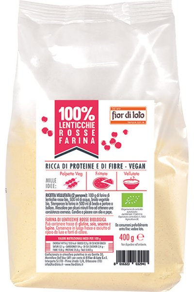 Farina di Lenticchie rosse ad alto contenuto di fibre e di proteine. Adatto ai vegani.