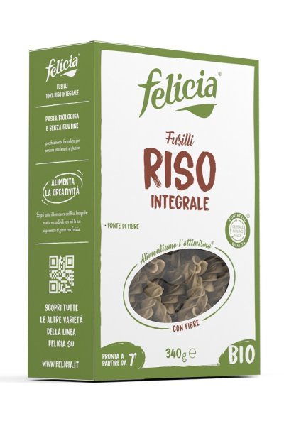 Pasta integrale altamente digeribile grazie alla leggerezza del riso integrale senza glutine.Formato fusilli, tempo di cottura, 6 - 8 minuti.