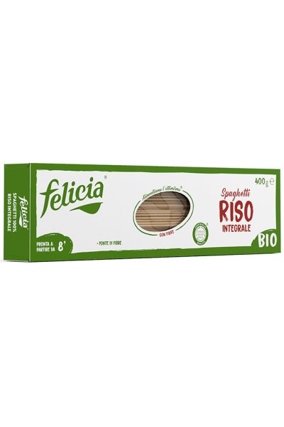 Spaghetti di riso da agricoltura biologica. Le fibre del riso integrale contribuiscono a mantenere il senso di sazietà.