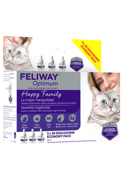 FELIWAY Optimum aiuta i gatti che presentano più segni di stress contemporaneamente, in diverse situazioni e li calma nel miglior modo possibile.