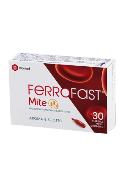 Integratore alimentare a base di ferro in liposomi formulato in capsule molli spremibili, utile in caso di carenza o aumentato fabbisogno di tale minerale. Senza glutine, senza lattosio, senza zuccheri.A base di ferro in liposomi utile in presenza di carenze alimentari o di aumentati fabbisogni organici di tale minerale. La sofisticata tecnologia di rivestimento e veicolazione del ferro pirofosfato in liposomi, utilizzata per Ferrofast® Mite, assicura una elevata biodisponibilità del minerale e un’ottima tollerabilità a livello gastrico. Ha un gradevole sapore di biscotto, senza retrogusto metallico. Il ferro è un microelemento indispensabile per molti processi metabolici, svolge importanti funzioni, quali il trasporto di ossigeno ai tessuti, contribuisce al normale metabolismo energetico e interviene nel processo di divisione cellulare. Il ferro inoltre contribuisce alla normale formazione di globuli rossi e di emoglobina, alla normale funzione cognitiva, alla normale funzione del sistema immunitario, alla riduzione di stanchezza e affaticamento.