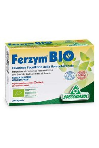 Integratore alimentare in comode capsule, con 2 miliardi di fermenti lattici tipizzati e stabilizzati con tecnica Dual CoatedR (3 ceppi selezionati) e fibre vegetali specifiche (Baobab, Acacia, Inulina), utile per favorire l’equilibrio della flora intestinale.Ferzym Bio è certificato 100% biologico.