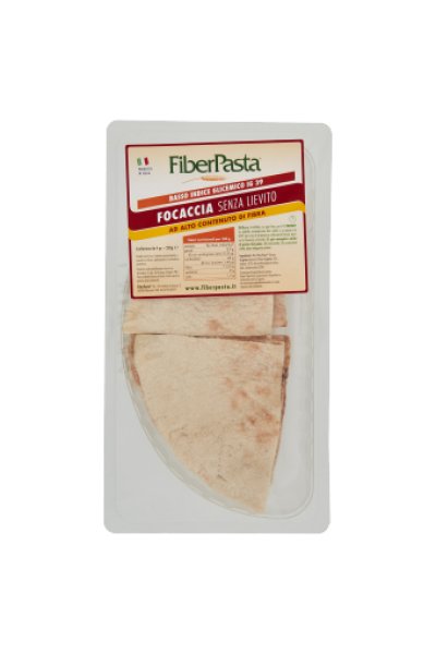 La focaccia FiberPasta è senza lievito, ha un basso indice glicemico (IG certificato: 39) e un alto contenuto di fibra (11,5%).