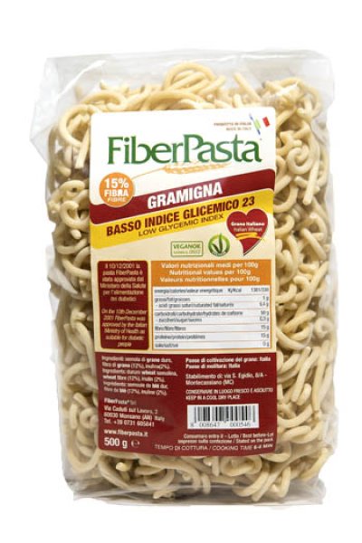 FiberPasta è una pasta a basso indice glicemico (IG certificato 23). Ha un elevato contenuto di fibra (15g x 100 g), oltre il doppio di fibra rispetto alle paste integrali, ed ha il sapore della pasta tradizionale. Grazie al suo basso indice glicemico, FiberPasta è consigliata da nutrizionisti nelle diete di diabetici, per il controllo del peso e del colesterolo, grazie al contributo della fibra solubile che offre sazietà, riduce l'assorbimento di grassi e zuccheri, ed offre benefici alla flora batterica intestinale. FiberPasta è inoltre utilizzata anche in ambito sportivo e consigliata da medici dello sport nelle diete degli sportivi, grazie al lento rilascio di carboidrati che mantiene l'energia per un tempo prolungato, evitando i picchi glicemici.