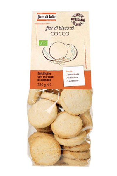 Biscotto preparato artigianalmente, dalla consistenza solida ma friabile, di colore bianco-giallo, profumo e gusto caratteristici del cocco. Dolcificato con sciroppo di mais e senza olio di palma. Senza lievito e uova. Ideale per vegani.
