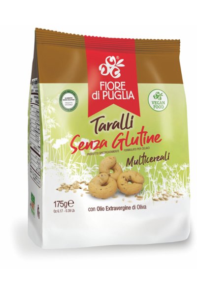 I taralli con farina multi cereali Fiore di Puglia, sono realizzati con la tipica ricetta della tradizione. Proprio perché privi di uova, latte e lievito, i nostri taralli possono essere gustati anche da chi soffre di celiachia. Le farine utilizzate rendono questi taralli ai cereali un prodotto ricco di fibre e a basso contenuto di grassi saturi. Il sapore inconfondibile del tarallo viene esaltato dall’utilizzo della farina ai multi cereali, che risulta fragrante, croccante e prelibato, rendendo il suo sapore rustico. Perfetto in accompagnamento ad aperitivi o anche sgranocchiati da soli, nei momenti di pausa.
