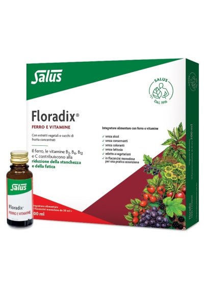 Integratore alimentare di ferro e vitamine B1, vitamina B2, vitamina B6, vitamina B12 e vitamina C; aiuta l'organismo a integrare le riserve di ferro e vitamine.Salus Floradix® è una risposta naturale alle necessità del nostro organismo di integrare il ferro. Per il suo alto valore vitaminico può essere assunto anche in situazioni di stanchezza e mancanza di energia. Grazie alla sua formula a base di estratti d’erbe e succhi di frutta è facile da digerire, non provoca stitichezza e ha un sapore gradevole.