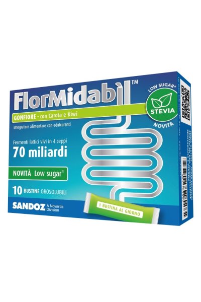 Formula Flormidabìl Sandoz di cui: Bifidobacterium lactis (Bl-04) Lactobacillus acidophilus (La14) Lactobacillus plantarum (SDZ11) Lactobacillus paracasei (SDZ22) | 70 miliardi UFC 52,5 miliardi UFC 14 miliardi UFC 2,8 miliardi UFC 0,7 miliardi UFC | |