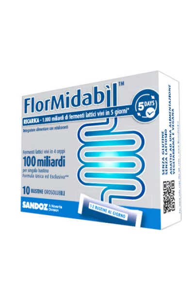 Formula Flormidabìil Sandoz, di cui: -bifidobacterium lactis (Bl-04) -lactobacillus acidophilus (La-04) -lactobacillus plantarum (SDZ-11) -lactobacillus paracasei (SDZ-22) | 100 mld UFC* 75 mld UFC 20 mld UFC 4,0 mld UFC 1,0 mld UFC | 200 mld UFC 150 mld UFC 40 mld UFC 8,0 mld UFC 2,0 mld UFC |