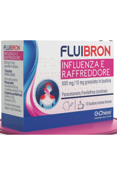 FLUIBRON INFLUENZA E RAFFREDDORE è un medicinale contenente i principi attivi paracetamolo e fenilefrina cloridrato che si usa per il trattamento del dolore, della febbre e della congestione.
