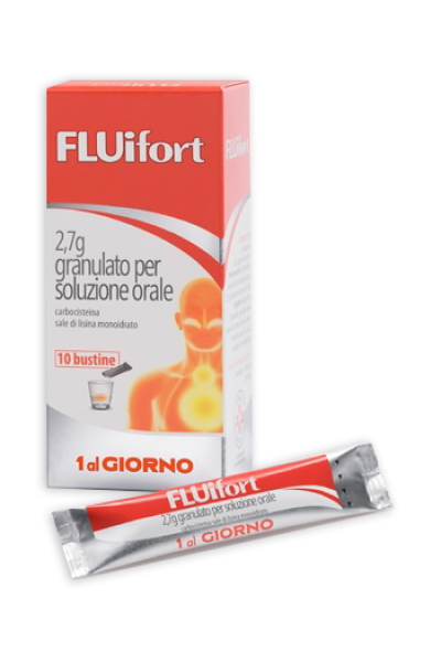 AvvertenzeNon sono noti fenomeni di assuefazione o dipendenza. Fluifort 2,7 g granulato per soluzione orale non influisce su diete ipocaloriche o controllate e può essere somministrato anche a pazienti diabetici. Fluifort 2,7 g granulato per soluzione orale non contiene glutine; pertanto può essere somministrato a pazienti affetti da celiachia. Fluifort 2,7 g granulato per soluzione orale contiene aspartame come dolcificante: tale sostanza è controindicata in soggetti affetti da fenilchetonuria. Sciogliere il contenuto della bustina in circa mezzo bicchiere d’acqua mescolando bene.