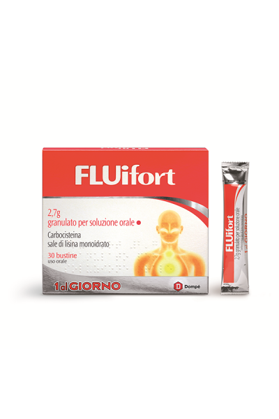 Fluifort contiene il principio attivo carbocisteina sale di lisina monoidrato, che appartiene ad un gruppo di medicinali per la tosse e per le malattie da raffreddamento chiamati mucolitici usati per facilitare l'eliminazione del muco dalle vie respiratorie.