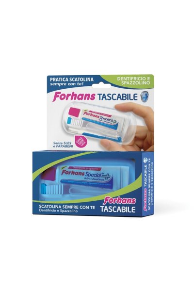 Kit tascabile per la cura dei denti. Scatolina disponibile in colori assortiti con all'interno uno spazzolino regolare composto da due parti assemblabili e un tubetto di pasta dentifricia Forhans Special.Cod. 07426N