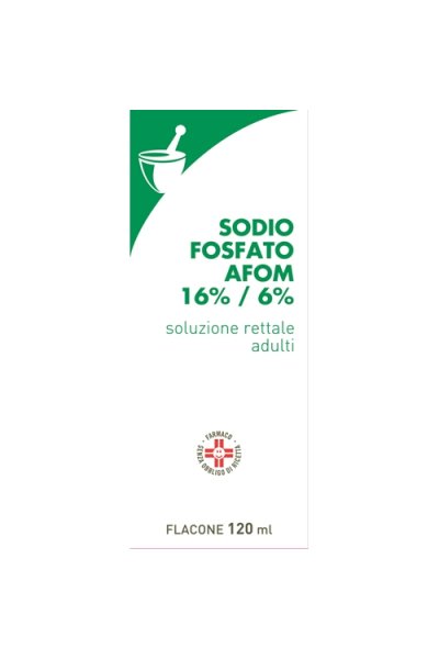 AvvertenzeIl flacone da 120 ml non deve essere utilizzato nei bambini di età inferiore a 12 anni. L’abuso di lassativi (uso frequente o prolungato o con dosi eccessive) può causare diarrea persistente con conseguente perdita di acqua, sali minerali (specialmente potassio) e altri fattori nutritivi essenziali. Nei casi più gravi è possibile l’insorgenza di disidratazione o ipopotassemia la quale può determinare disfunzioni cardiache o neuromuscolari, specialmente in caso di contemporaneo trattamento con glicosidi cardiaci, diuretici, o corticosteroidi. I pazienti devono essere incoraggiati a bere liquidi per aiutare a prevenire la disidratazione, in particolare i pazienti con condizioni che possono predisporre a disidratazione, o quelli che assumono medicinali che possono diminuire la velocità di filtrazione glomerulare, come i diuretici, gli inibitori dell’enzima di conversione dell’angiotensina (ACE inibitori), i bloccanti del recettore dell’angiotensina (sartani) o gli anti-infiammatori non steroidei (FANS). Dato che Sodio fosfato AFOM 16% / 6% soluzione rettalecontiene fosfati di sodio, vi è il rischio di elevati livelli sierici di sodio e fosfato e diminuzione dei livelli di calcio e potassio, e di conseguenza ipernatriemia, iperfosfatemia, ipocalcemia e ipopotassiemia, che si possono verificare con segni clinici come tetania e insufficienza renale. L’abuso di lassativi può causare dipendenza (e, quindi, possibile necessità di aumentare progressivamente il dosaggio), stitichezza cronica e perdita delle normali funzioni intestinali (atonia intestinale). L’uso ripetuto di lassativi può dare origine ad assuefazione o danni di diverso tipo. L’impiego prolungato di un lassativo per il trattamento della stipsi è sconsigliato. Il trattamento farmacologico della stipsi deve essere considerato un adiuvante al trattamento igienico-dietetico (es. incremento di fibre vegetali e liquidi nell’alimentazione, attività fisica e rieducazione della motilità intestinale).Il trattamento della stitichezza cronica o ricorrente richiede sempre l’intervento del medico per la diagnosi, la prescrizione dei farmaci e la sorveglianza nel corso della terapia. Un’attenta valutazione del medico è indispensabile quando la necessità del lassativo deriva da un improvviso cambiamento delle precedenti abitudini intestinali (frequenza e caratteristiche delle evacuazioni) che duri da più di due settimane o quando l’uso del lassativo non riesce a produrre effetti. È opportuno che i soggetti anziani o in non buone condizioni di salute e i pazienti con ipertensione arteriosa non controllata, ascite, malattie cardiache, cambiamenti della mucosa rettale (ulcere, fessure), consultino il medico prima di usare il medicinale. I pazienti devono essere avvertiti di interrompere la somministrazione, se si incontra resistenza, dato che la somministrazione forzata del clistere può provocare lesioni. Negli episodi di stitichezza, si consiglia innanzitutto di correggere le abitudini alimentari integrando la dieta quotidiana con un adeguato apporto di fibre ed acqua. Quando si utilizzano lassativi è opportuno bere al giorno almeno 6-8 bicchieri di acqua, o altri liquidi, in modo da favorire l’ammorbidimento delle feci. Informazioni importanti su alcuni eccipienti: Sodio fosfato AFOM 16% / 6% soluzione rettale contiene metile paraidrossibenzoato sodico e propile paraidrossibenzoato sodico che possono causare reazioni allergiche (anche ritardate).